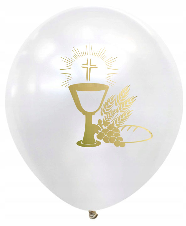 Zestaw 10 komunijnych balonów w kolorze biało - złotym. Gustowny komplet doskonale sprawdzi się jako dekoracja podczas uroczystości Pierwszej Komunii Świętej. W skład zestawu wchodzi 5 szt. balonów lateksowych w rozmiarze 12 cali, w kolorze białym ze złotym nadrukiem kielicha oraz 5 szt. balonów w kolorze metalicznego złota. Balony można pompować helem lub powietrzem. Wykonane są z naturalnego lateksu kauczukowego, biodegradowalnego w 100%. Komplet idealnie nadaje się do montażu na stojaku do balonów, zawiązywania na wstążce lub podklejania na taśmę dwustronną.