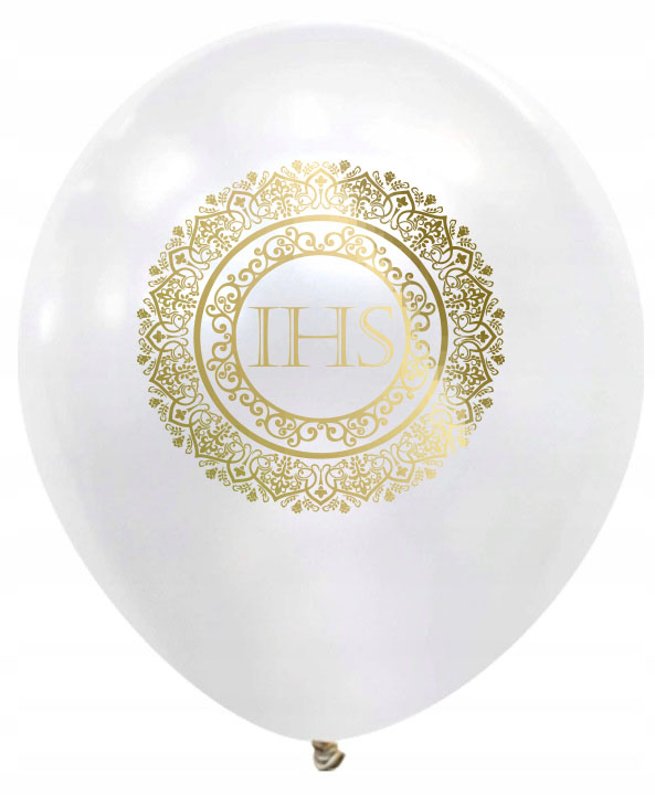 Zestaw 10 komunijnych balonów w kolorze biało - złotym. Gustowny komplet doskonale sprawdzi się jako dekoracja podczas uroczystości Pierwszej Komunii Świętej. W skład zestawu wchodzi 10 szt. balonów lateksowych w rozmiarze 12 cali, w kolorze białym ze złotym nadrukiem hostii. Balony można pompować helem lub powietrzem. Wykonane są z naturalnego lateksu kauczukowego, biodegradowalnego w 100%. Komplet idealnie nadaje się do montażu na stojaku do balonów, zawiązywania na wstążce lub podklejania na taśmę dwustronną.