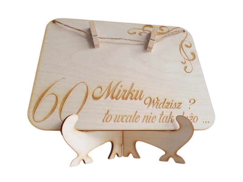 Drewniana tabliczka z Imieniem i grawerem na urodziny. Ten upominek z pewnością wywoła uśmiech na twarzy obdarowywanego i będzie wspaniałą pamiątką. Kartka z grawerem: 60 - Widzisz to wcale nie tak dużo to niebanalny pomysł na wystrzałowy prezent. Prosta drewniana forma została wzbogacona o sznurek jutowy i drewniane klamerki oraz wygrawerowany wzór. Na tabliczce można umieścić jedno imię, ksywkę oraz dowolny wiek. Zaskocz bliskich prezentem który zostanie zapamiętany na długo. Drewniana kartka na prezent to oryginalny pomysł wręczenia banknotów, które solenizant wykorzysta w najlepszy dla siebie sposób.