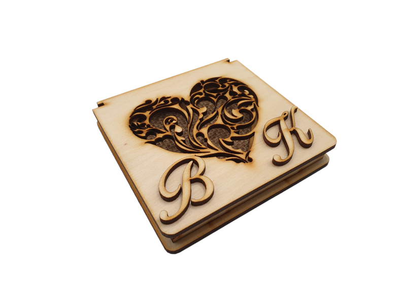 Drewniana szkatułka idealnie sprawdzi się jako pudełeczko na obrączki ślubne. Klasyczna forma pudełeczka wzbogacona została o jutę wewnątrz serduszka, inicjały Pary Młodej na wieczku i wycięte ażurowe serce. Gustowne pudełeczko wspaniale zaprezentuje się podczas sesji zdjęciowej w dniu ślubu a po ceremonii będzie miłą pamiątką, w której można przechowywać różne ozdoby i drobiazgi.