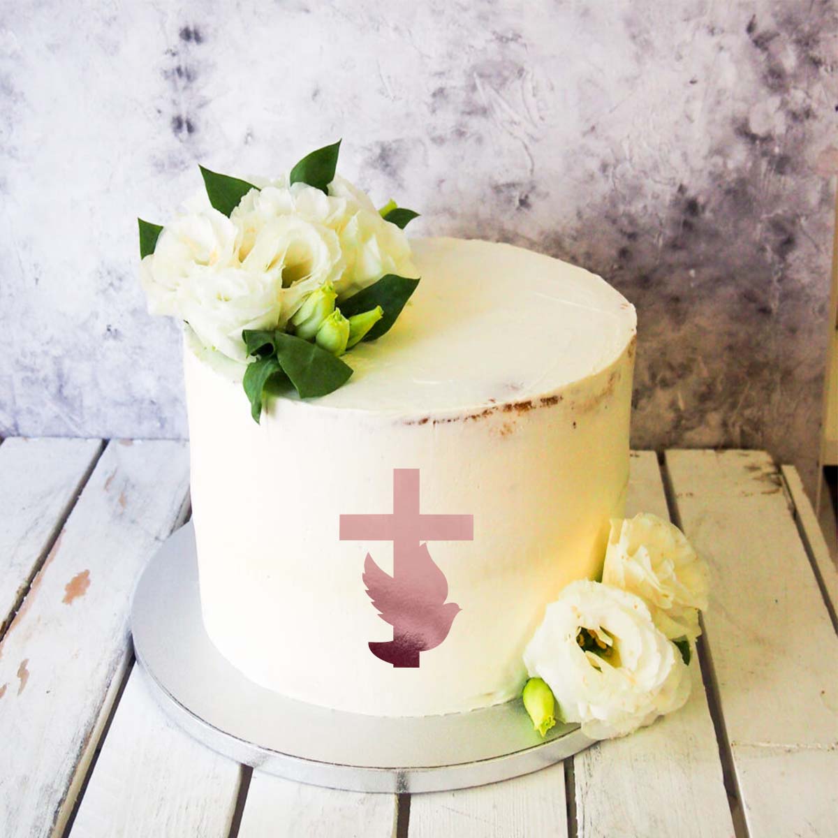 Emblemat na księgę gości, album do zdjęć w kolorze różowego złota, dekoracja na Pierwszą Komunię Świętą lub Chrzest Święty. Gustowna ozdoba, podkreśli wyjątkowy charakter uroczystości i będzie miłą pamiątką. Emblemat można także wykorzystać do dekoracji innych elementów tj. kartek, zaproszeń, podziękowań czy tortów i ciast. Element jest bardzo lekki dzięki czemu z łatwością przykleimy go do gładkiej powierzchni za pomocą kropek klejowych, kleju do papieru lub drewna. W ofercie sam emblemat. Elementy takie jak tort czy album nie wchodzą w skład ofert służą one tylko do prezentacji produktu.