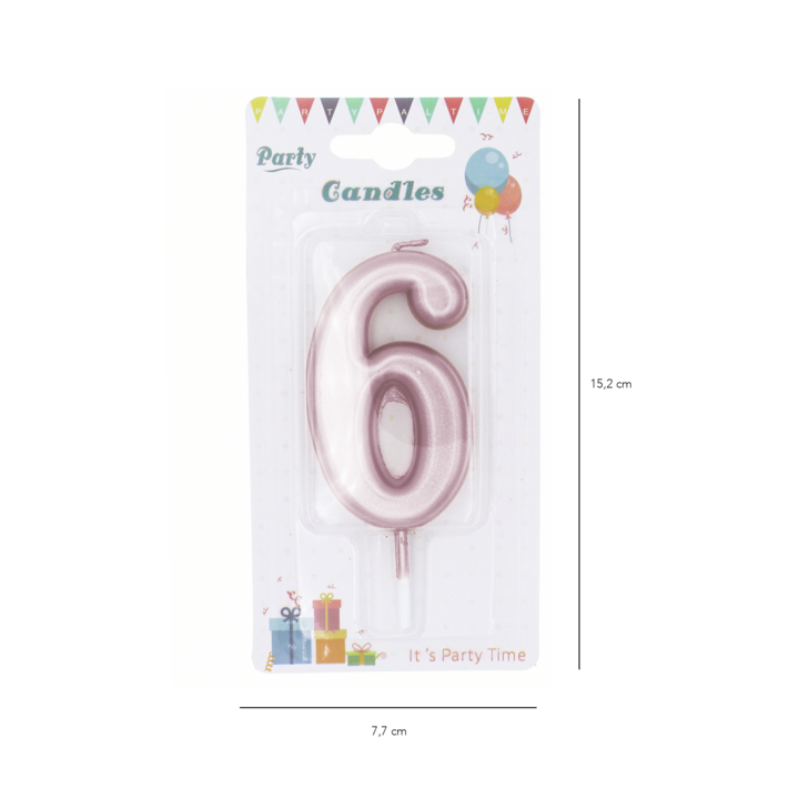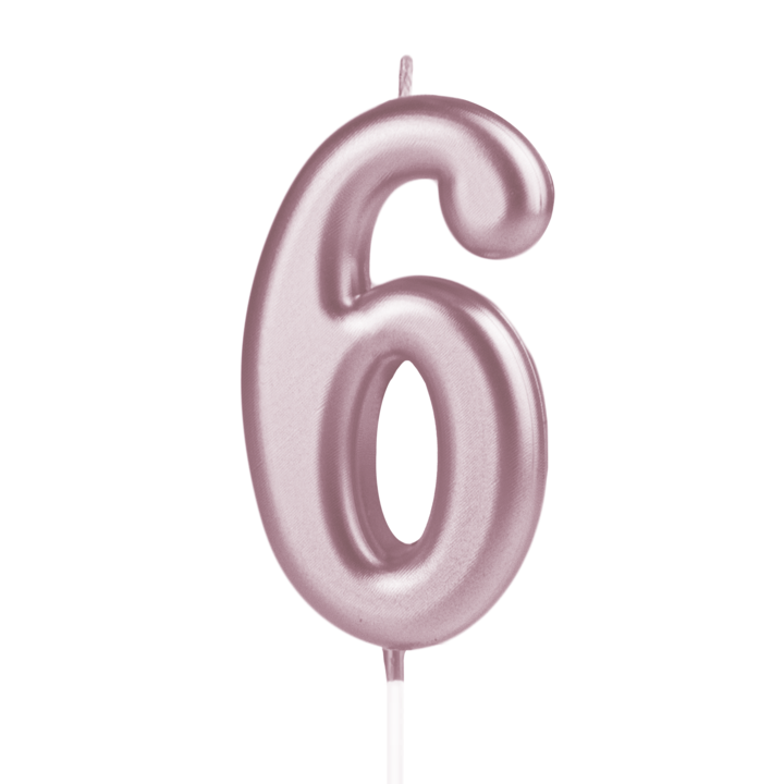 Urodzinowa świeczka cyfra 6 na tort w kolorze różowego złota. W sprzedaży posiadamy świeczki od 0 do 9. Ustawiając w rzędzie, pojedyncze cyfry na torcie, utworzysz dowolną liczbę - taką jaką potrzebujesz. Każda świeczka jest osobno zapakowana w blister. Wysokość świeczki to około 10 cm, szerokość około 4 cm. Metaliczne świeczki w kolorze różowego złota przepięknie mienią się w świetle, są doskonałą ozdobą tortów, ciast, babeczek na różne okazje tj. urodziny, rocznice i jubileusze.