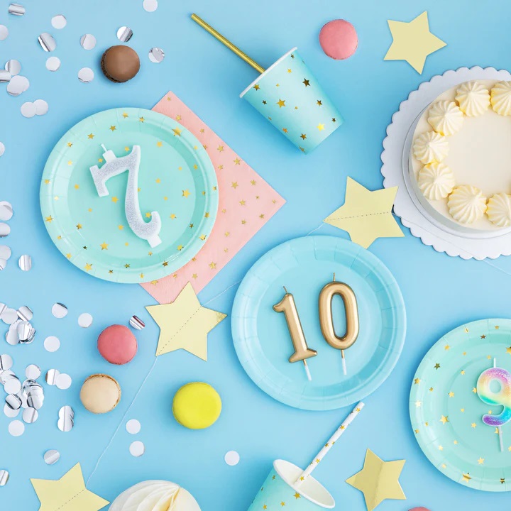 Urodzinowa świeczka cyfra 7 na tort w kolorze złotym. W sprzedaży posiadamy świeczki od 0 do 9. Ustawiając w rzędzie, pojedyncze cyfry na torcie, utworzysz dowolną liczbę - taką jaką potrzebujesz. Każda świeczka jest osobno zapakowana w blister. Wysokość świeczki to około 7 cm, szerokość około 4 cm. Metaliczne świeczki w kolorze złotym przepięknie mienią się w świetle, są doskonałą ozdobą tortów, ciast, babeczek na różne okazje tj. urodziny, rocznice i jubileusze.